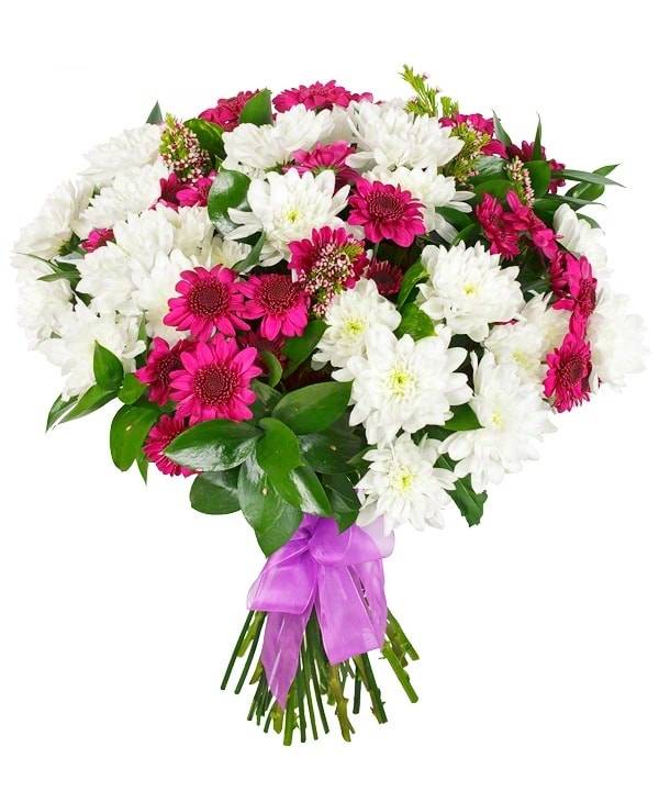 Выразительности букету придает контрастная расцветка – белый и розовый цвета привлекут внимание как мужчины, так и женщины. Цветочная композиция поможет выразить уважение коллеге и старшему другу, извиниться перед любимой женщиной. Хризантемы также раскроют чувство доверия и благодарности, радуя своей красотой и нежностью на протяжении долгого времени.